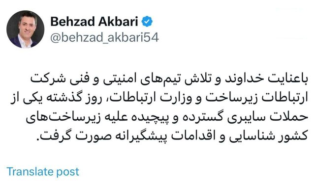 به گزارش پایگاه خبری تحلیلی پایشگر، بهزاد اکبری – معاون وزیر ارتباطات و مدیرعامل شرکت ارتباطات زیرساخت کشور – در پستی در شبکه اجتماعی ایکس، اعلام کرد: با عنایت خداوند و تلاش تیمهای امنیتی و فنی شرکت ارتباطات زیر ساخت و وزارت ارتباطات روز گذشته یکی از حملات سایبری گسترده و پیچیده علیه زیر ساختهای کشور شناسایی و اقدامات پیشگیرانه صورت گرفت.