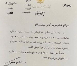 به گزارش پایگاه خبری تحلیلی پایشگر، عبدالناصر همتی رئیس کل بانک مرکزی با صدور حکمی مریم آقائی را بعنوان سرپرست روابط عمومی این بانک منصوب کرد.